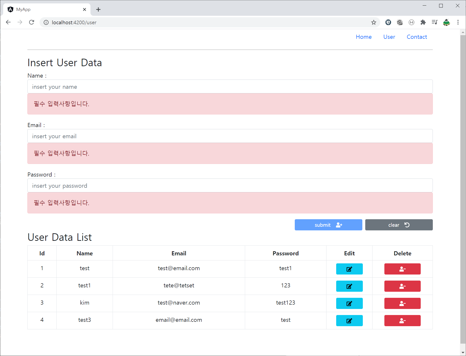 초기 실행화면에서는 입력값에 대해 Required Error가 발생되었있기에,